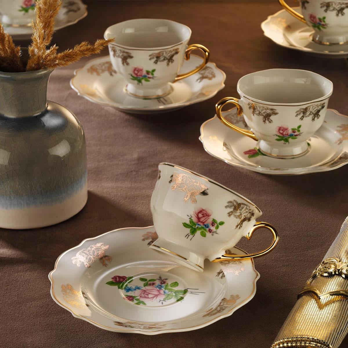 Bohem Porselen Çay Fincan Takımı 6 Kişilik Altın Yaldızlı Gül Desenli (MS-1212)