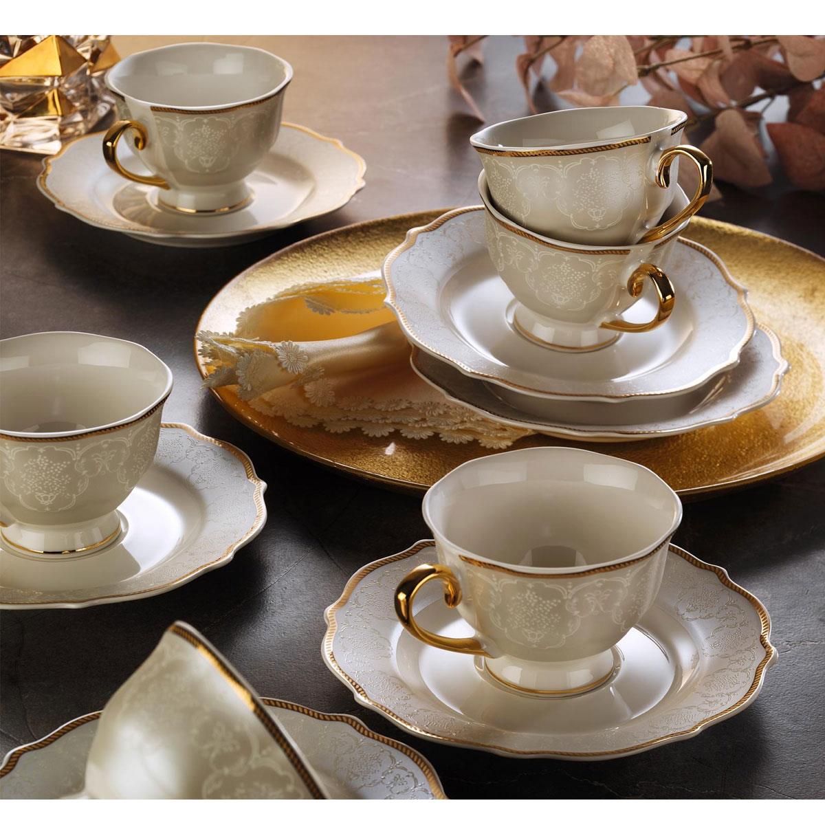 Dora 6 kişilik porselen çay fincan takımı, altın yaldız detaylı lüks sofra sunumu.
