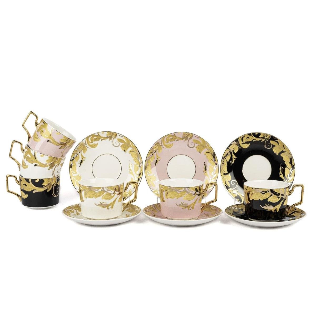 Mikasa Moor Elegance Gold Desenli Porselen 6 Kişilik Çay Fincanı Seti, Siyah Beyaz ve Pembe Renkler