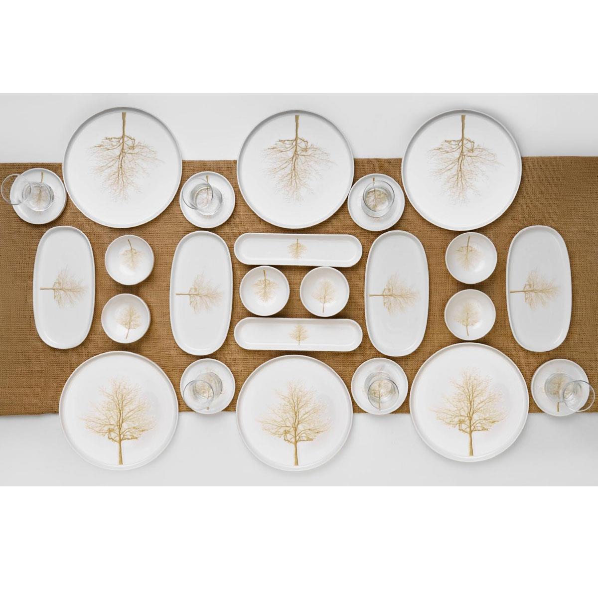 Takımın en çarpıcı detayı olan, tabakların merkezinde yer alan altın tonlarındaki zarif ağaç/kök desenleri, doğallığı ve dinginliği sofranıza taşır. Bu minimal çizgi, takımın lüks algısını güçlendirir ve özellikle ahşap, mermer gibi doğal malzemelerle dekore edilmiş masalarda çarpıcı bir ahenk yaratır.